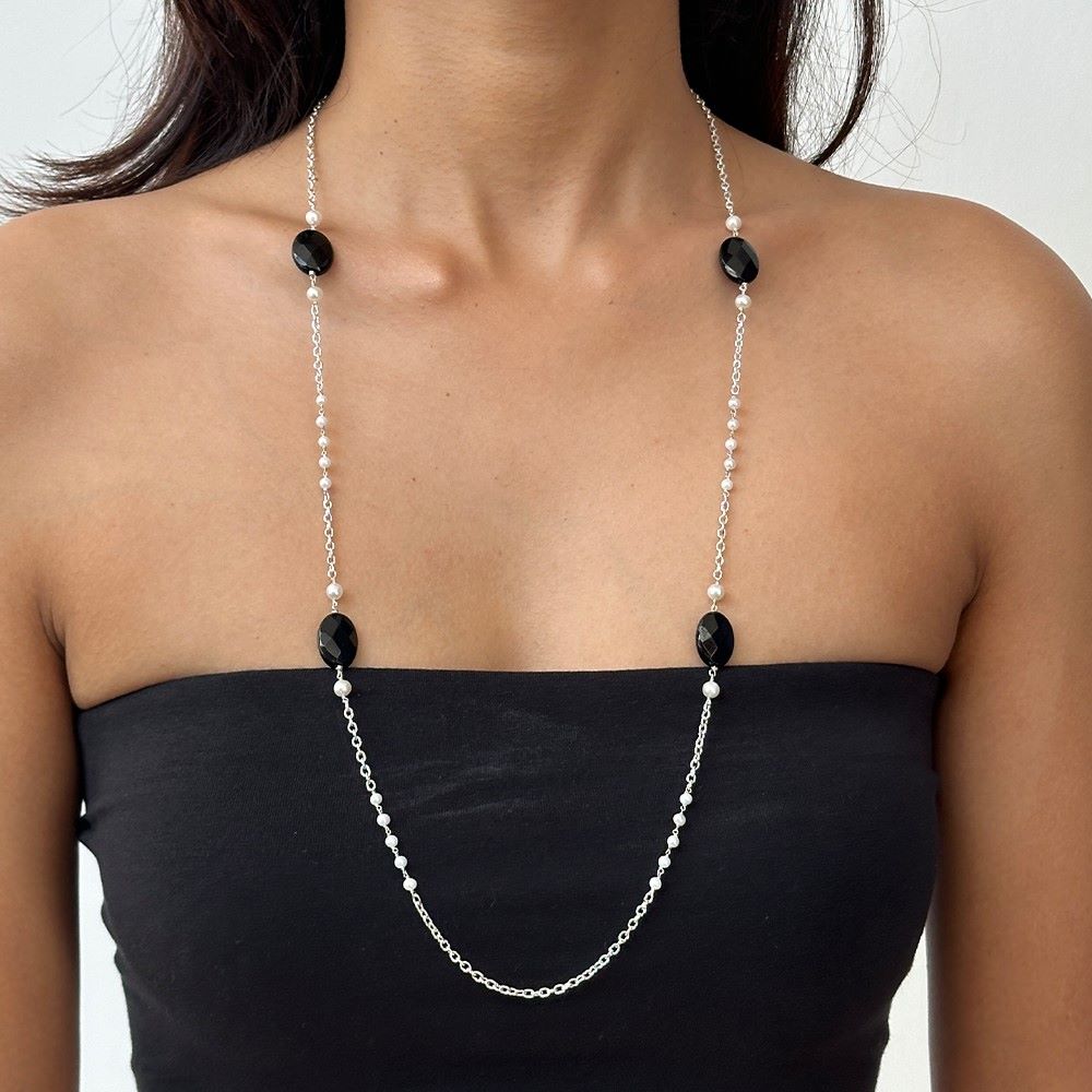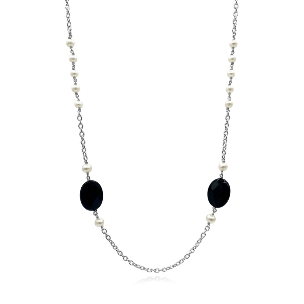 A delicate balance of faceted onyx and glowing pearls, this sterling silver necklace radiates understated elegance with a touch of midnight charm.