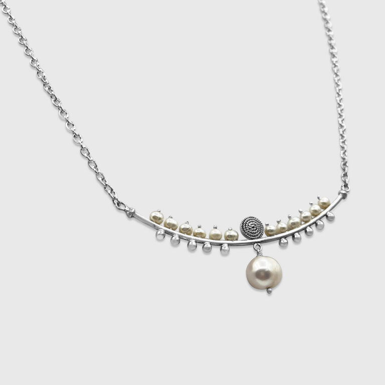 A graceful arc of cultured pearls, crowned with a freshwater pearl drop and a delicate silver scroll—timeless elegance in every detail.