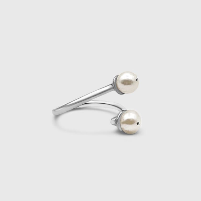 Two luminous pearls meet in a fluid silver twist—minimal, modern, and endlessly elegant.